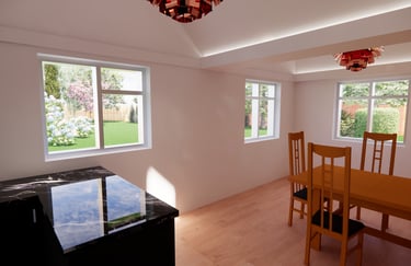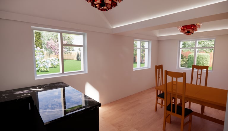 External renders showing the new bedroom, kitchen and utility showing the client a clearer understanding of what the proposed design will look like before being built.