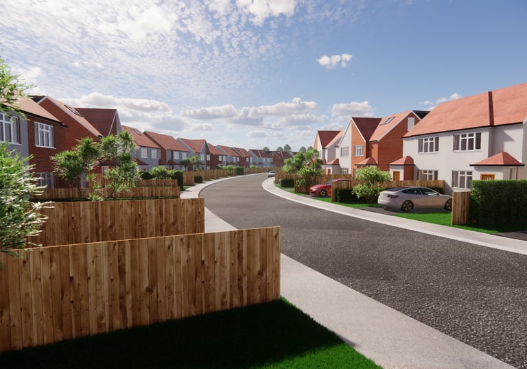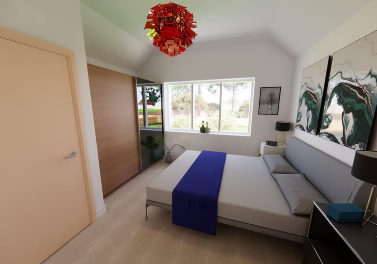 Internal render showing new master bedroom with en suite to the rear of the property